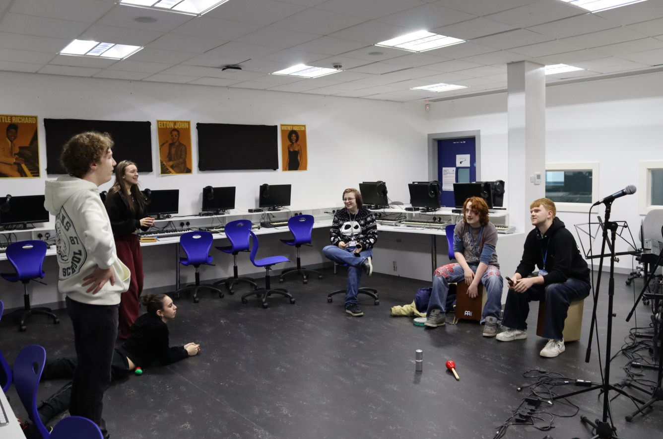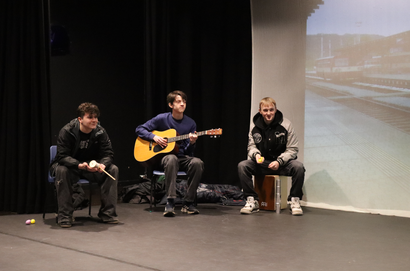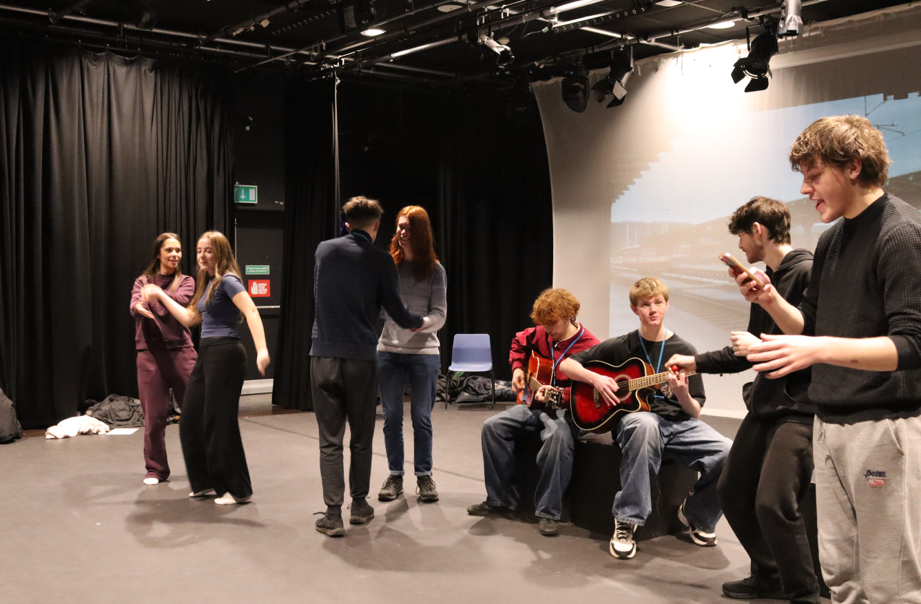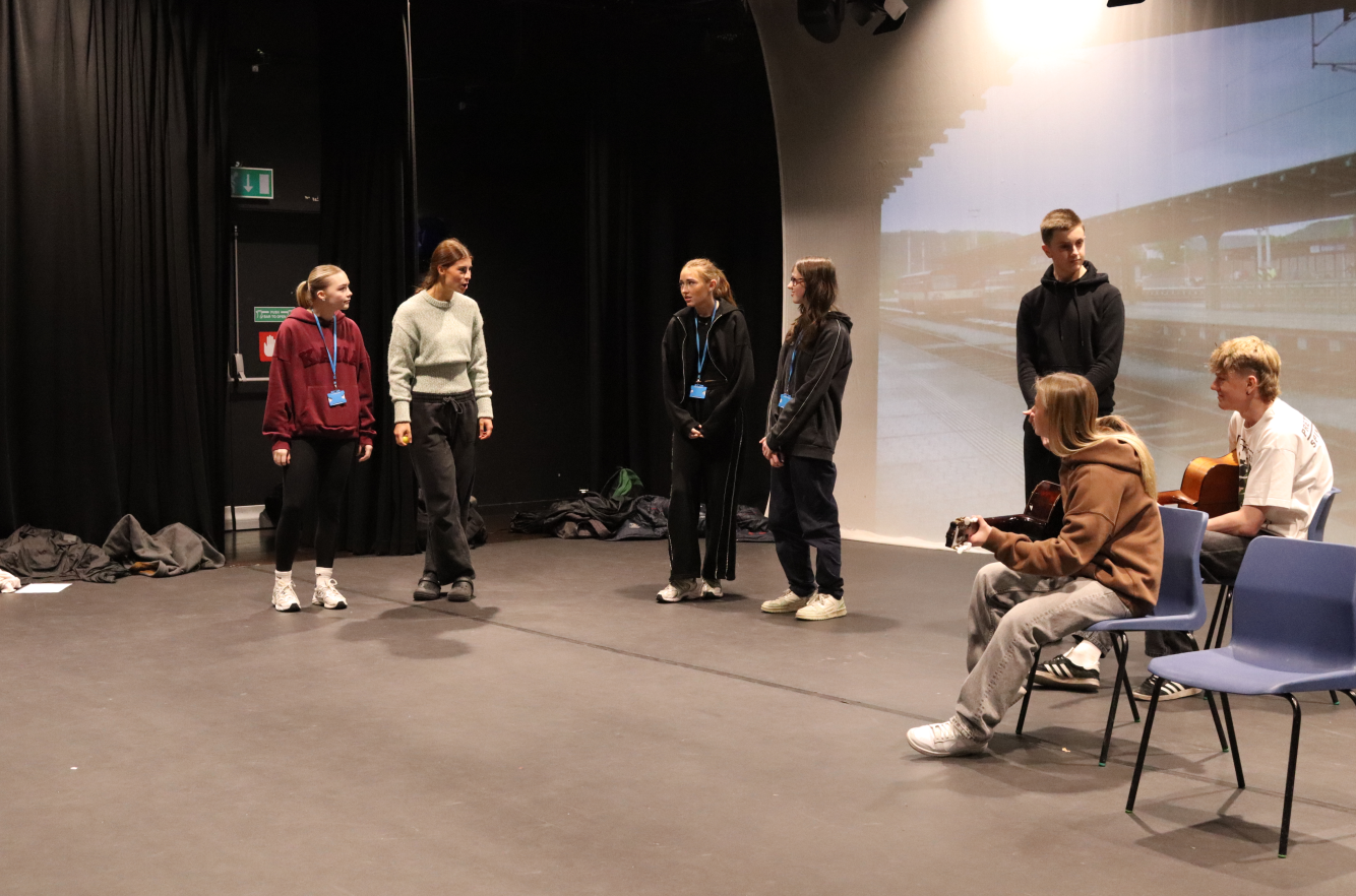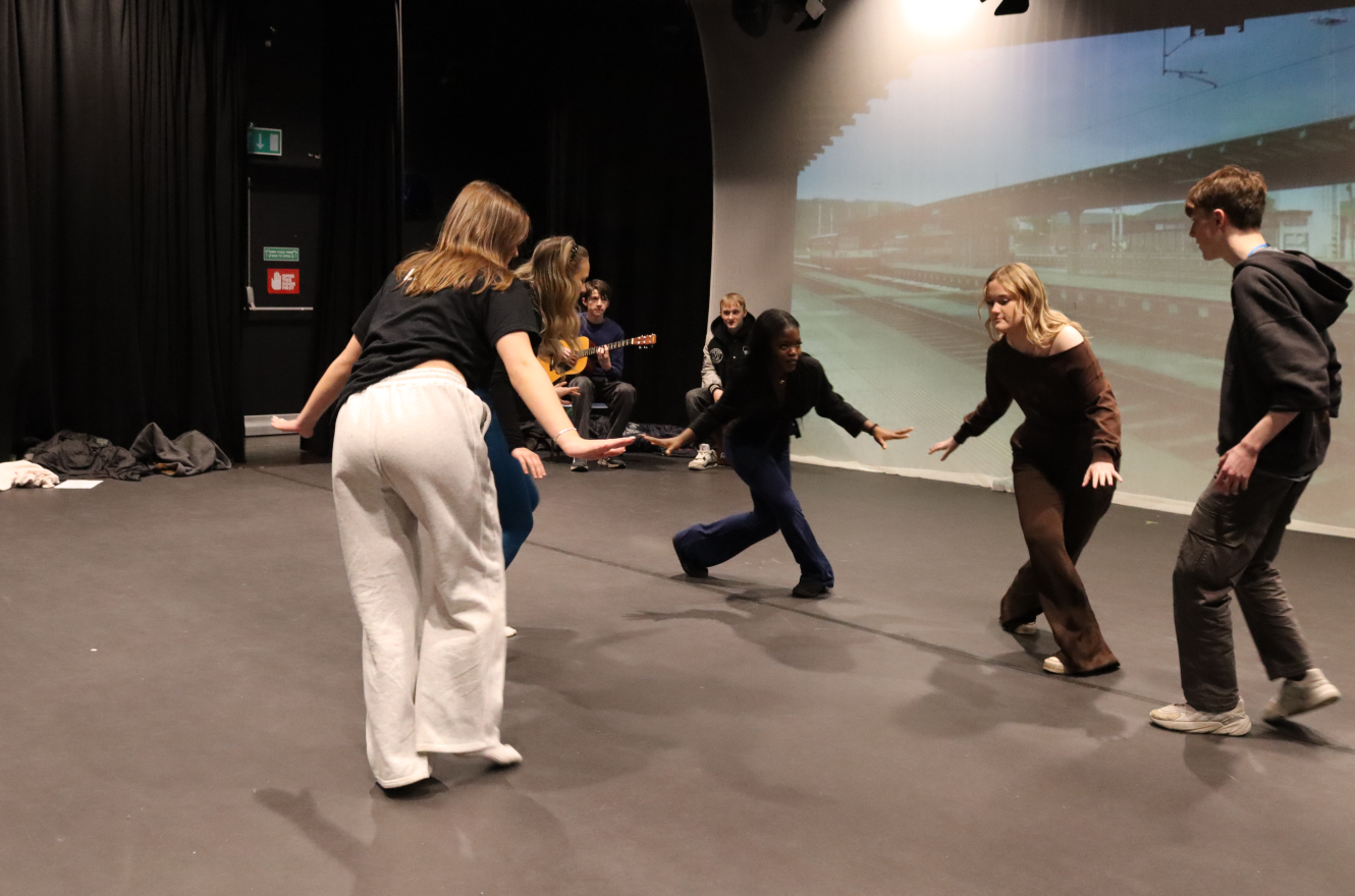Alongside this, alumni Lois Broadbent, who has progressed to BA Acting at Rose Bruford College, led an interactive workshop where students worked in groups to devise and present a two-minute performance based on the prompt, “People meet on a railway platform in unexpected weather.” The session also provided a valuable opportunity for students to network, collaborate and meet fellow students from different courses within the performing arts department.