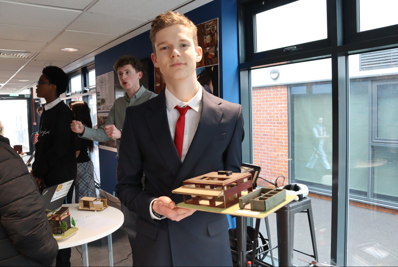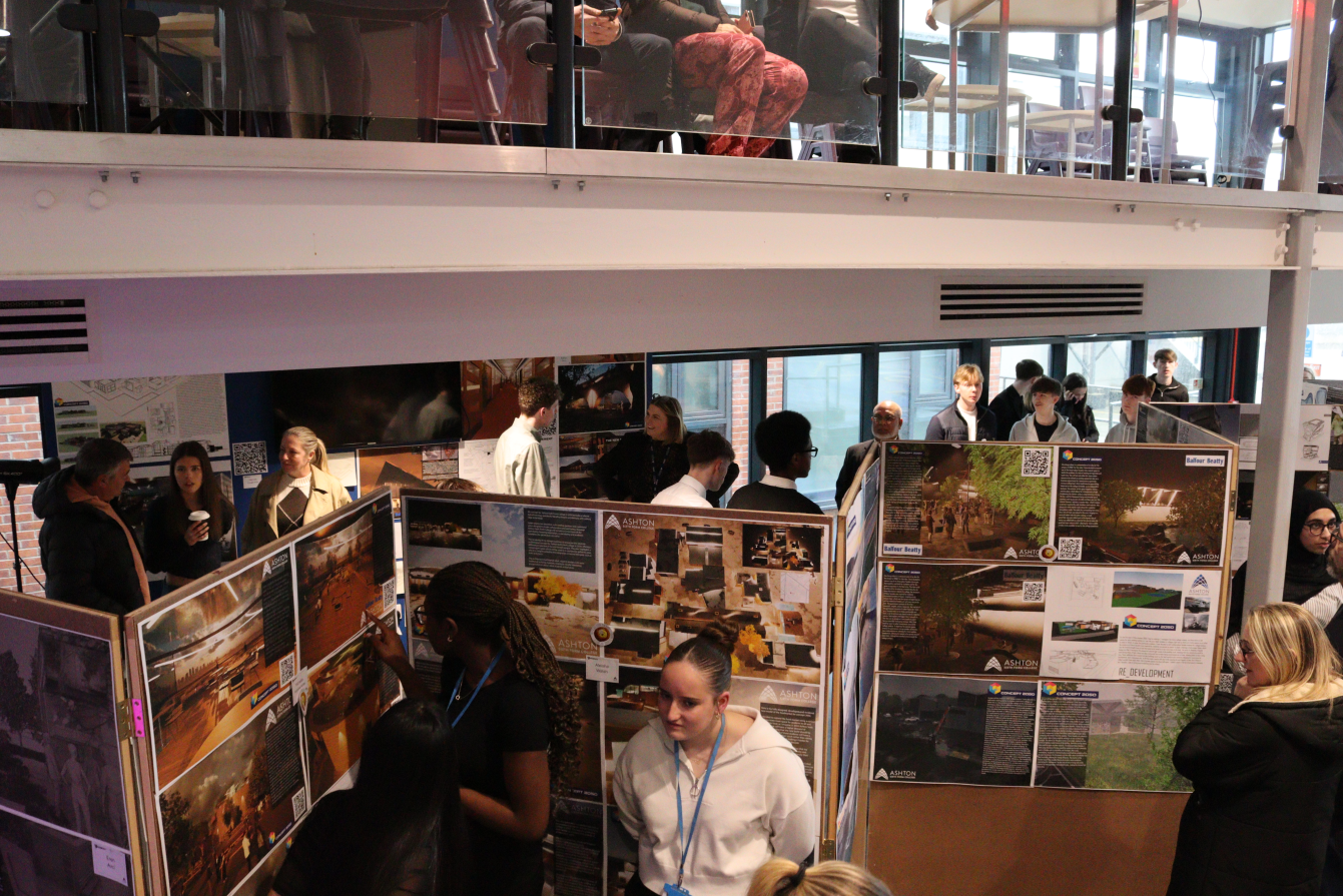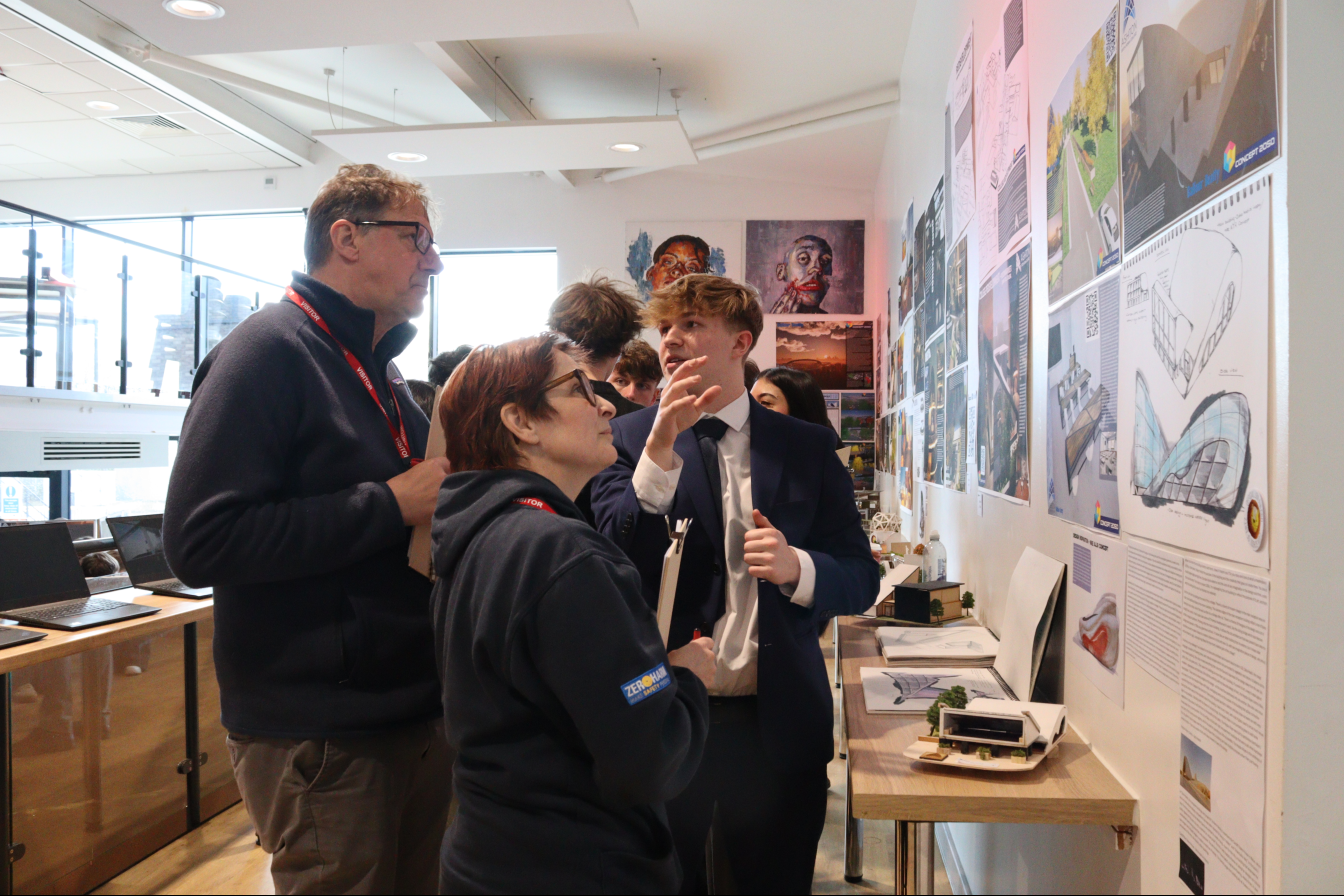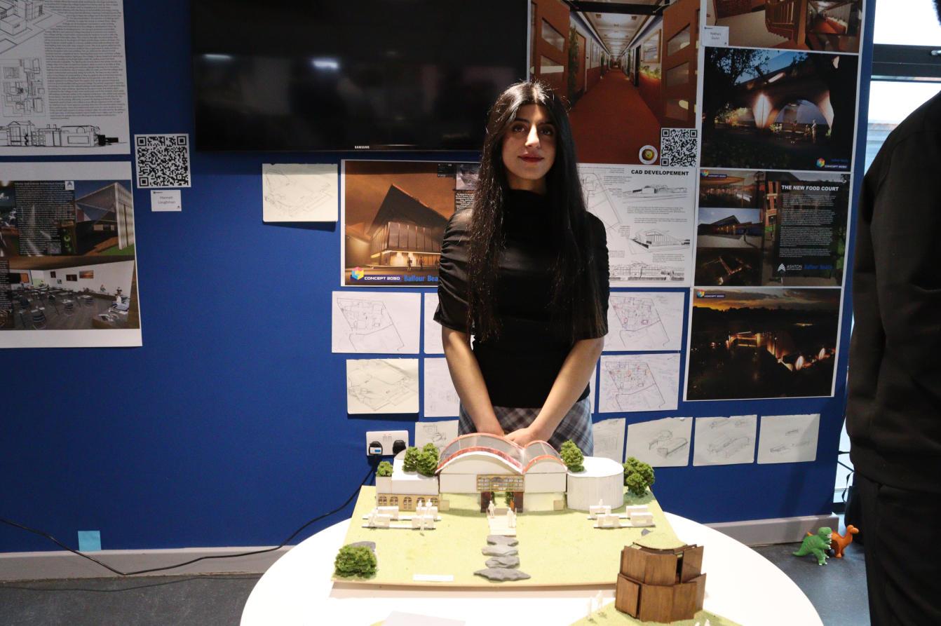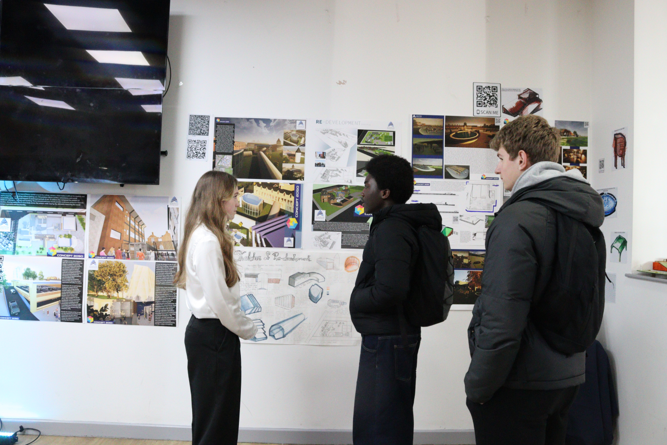 Throughout the project, they have followed the full design process, from early ideas and sketching through to refined designs and model making using specialist equipment. The final outcomes highlight impressive creativity, problem-solving and technical ability. The exhibition featured 3D models of the reimagined campus, alongside graphics and video mock-ups that brought students’ designs to life.